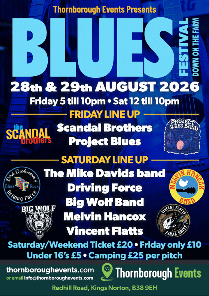 This year brings an impressive mix of bands and performers—ranging from raw blues-rock to soulful guitar-driven sets—making it one of the standout weekends in the Thornborough calendar.
